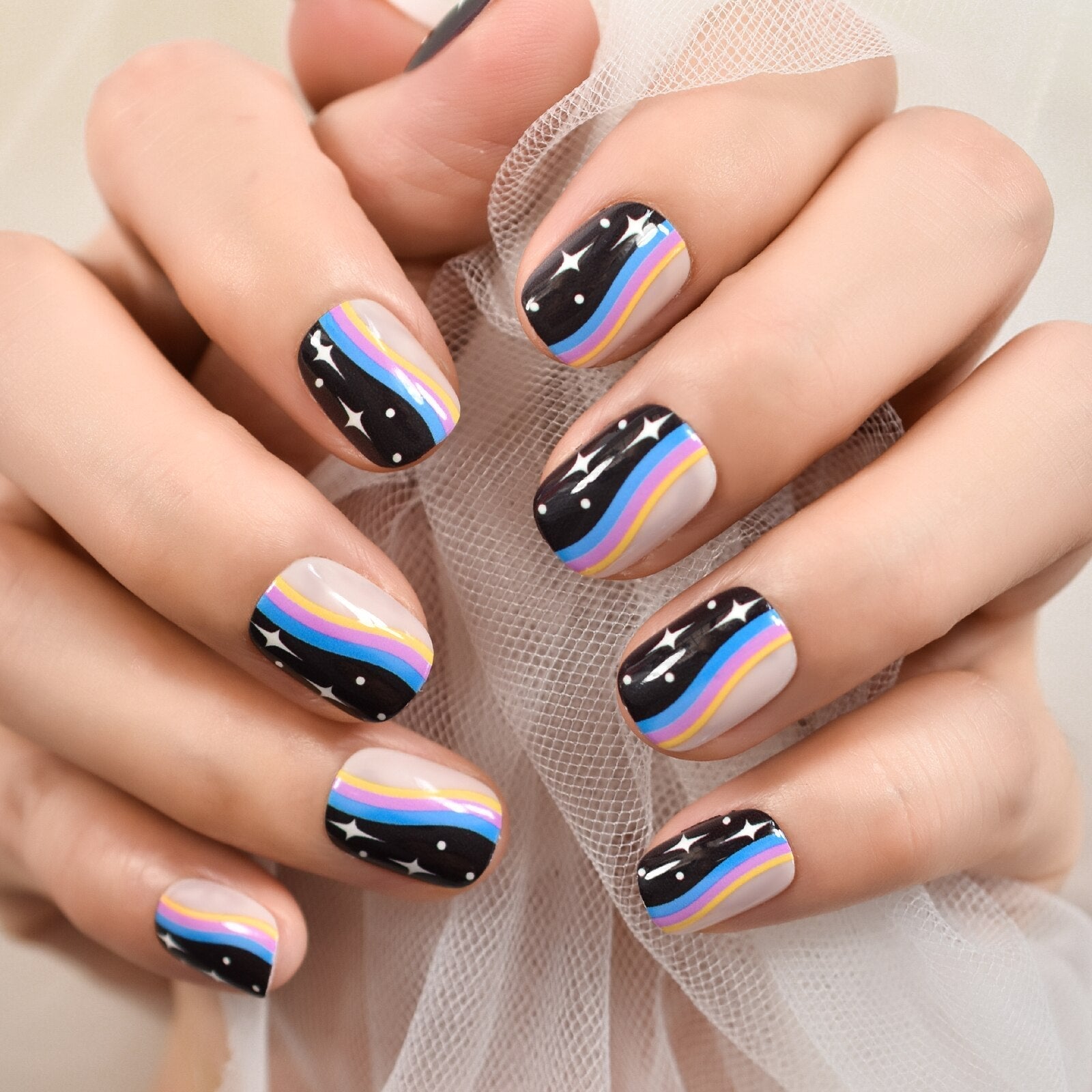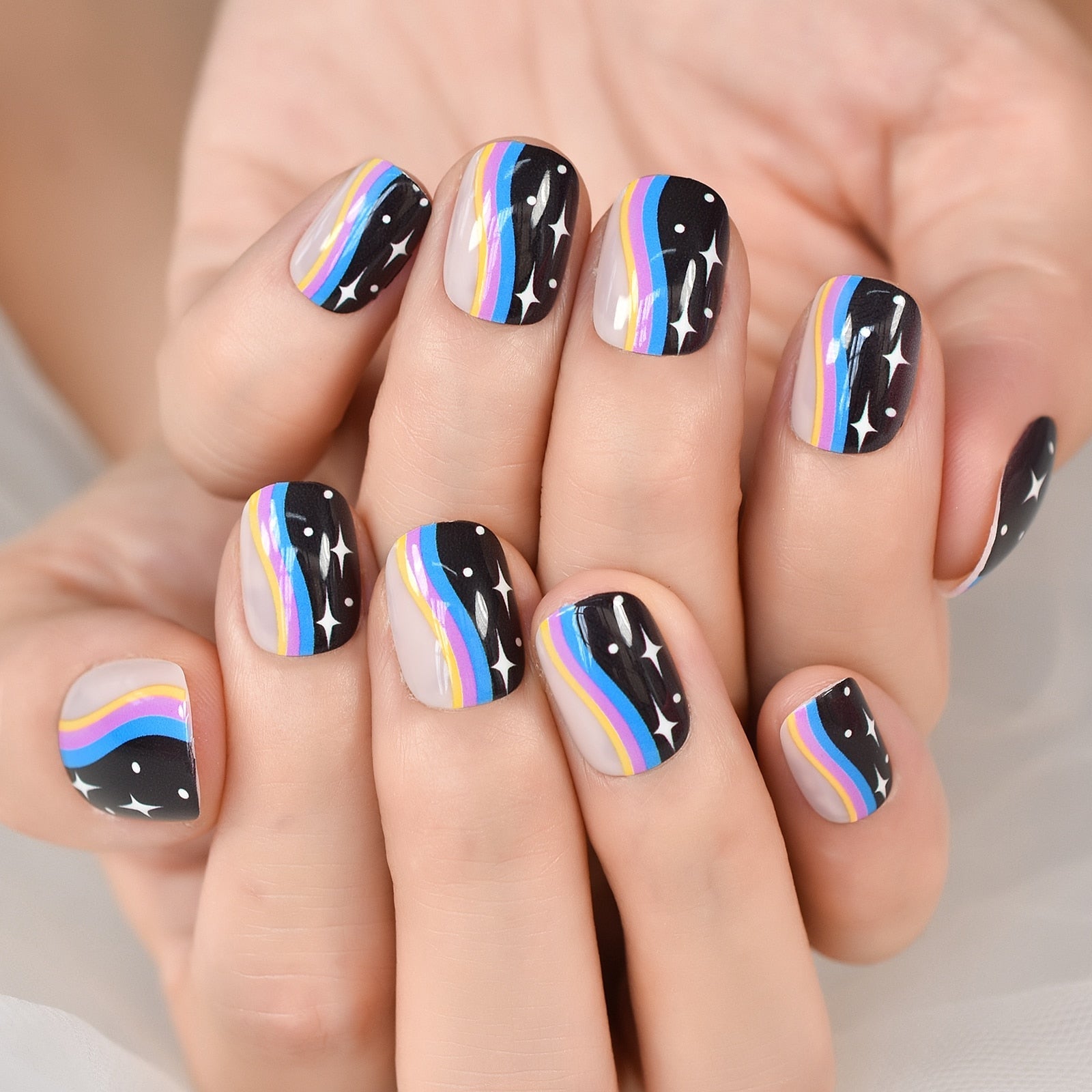 Including: 1 kit of 23~24pcs nails + 1 sheet of glue sticker.